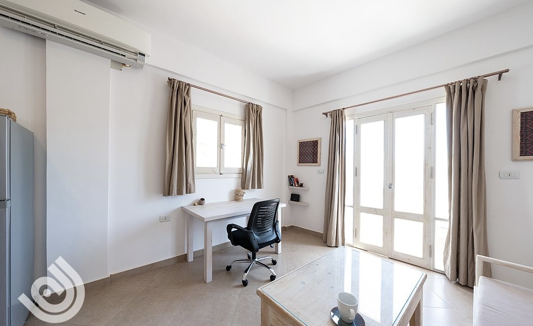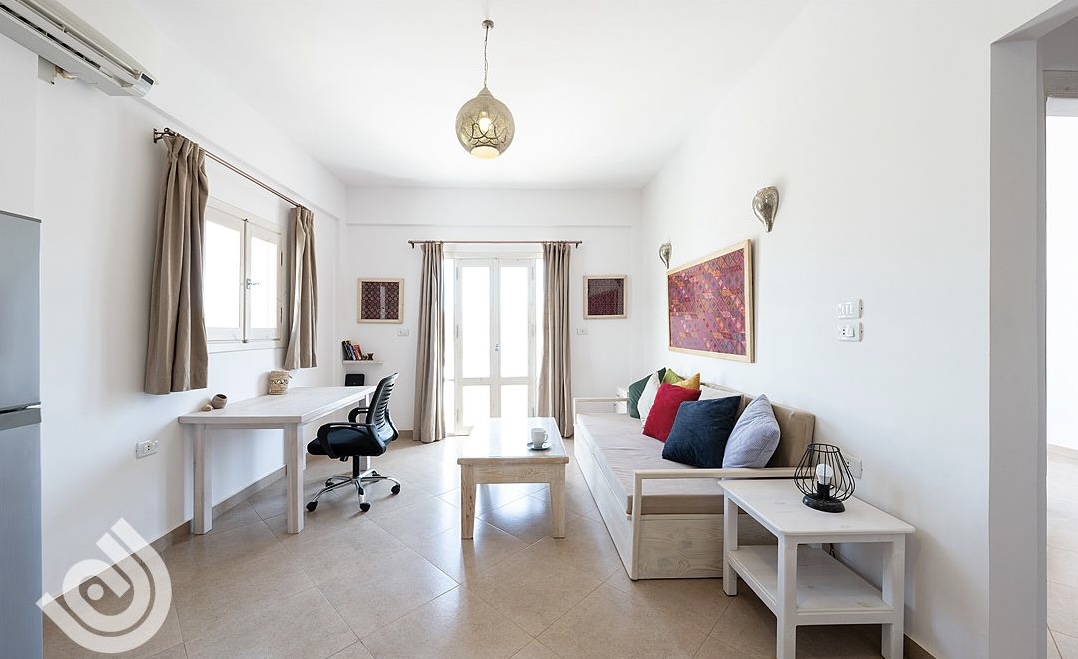 Nestled in the heart of Dahab, our 2-bedroom oasis offers a serene getaway. Awash in whitewashed charm, this tranquil retreat boasts a spacious living room blending seamlessly with a fully-equipped kitchen. Adorned with two cozy bedrooms – one hosting a queen bed and the other, two snug beds – our haven accommodates the wanderlust of families or friends seeking a coastal respite. Immerse yourself in the vibrant local culture just moments away or savor the sea breeze from the nearby beach.