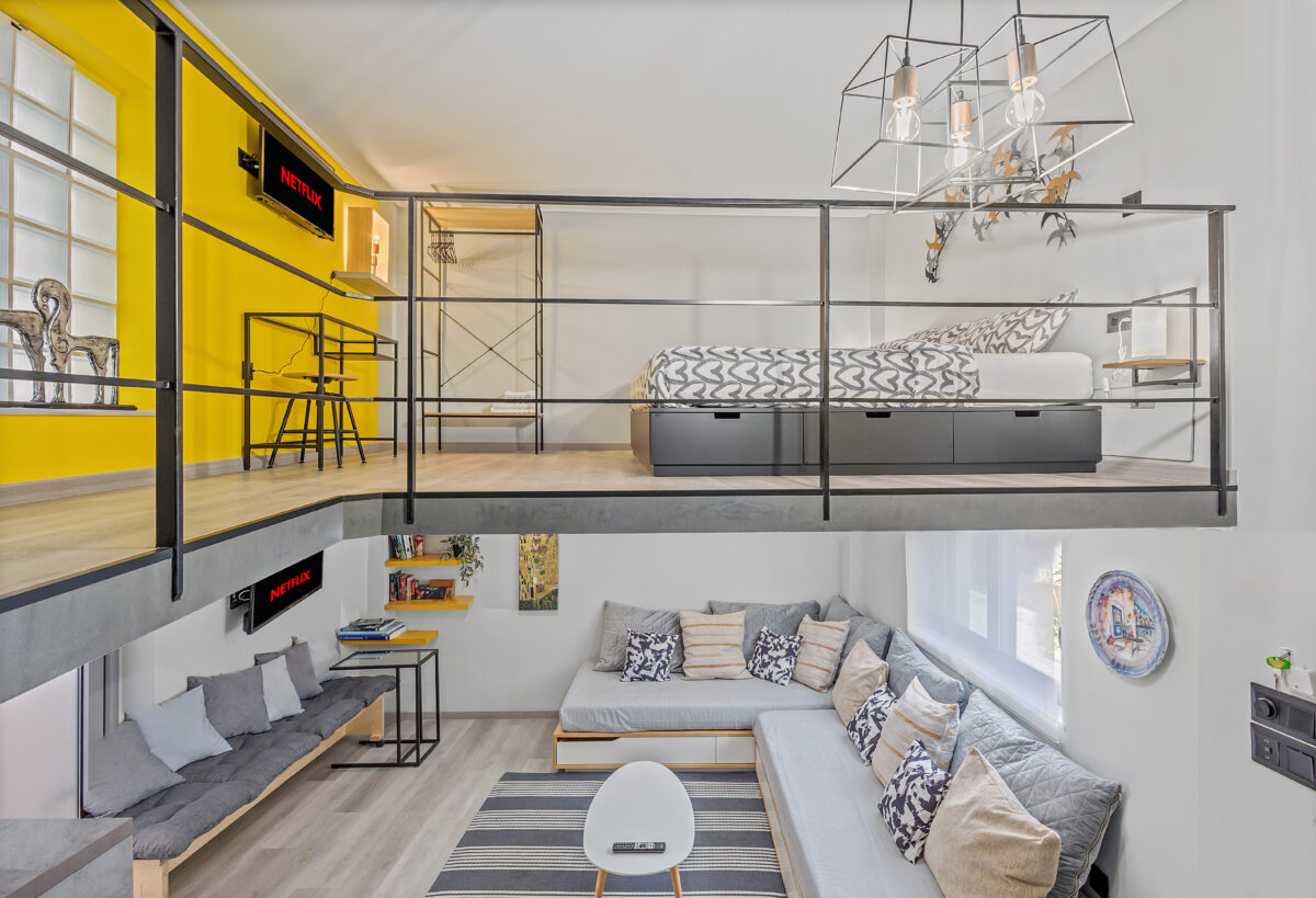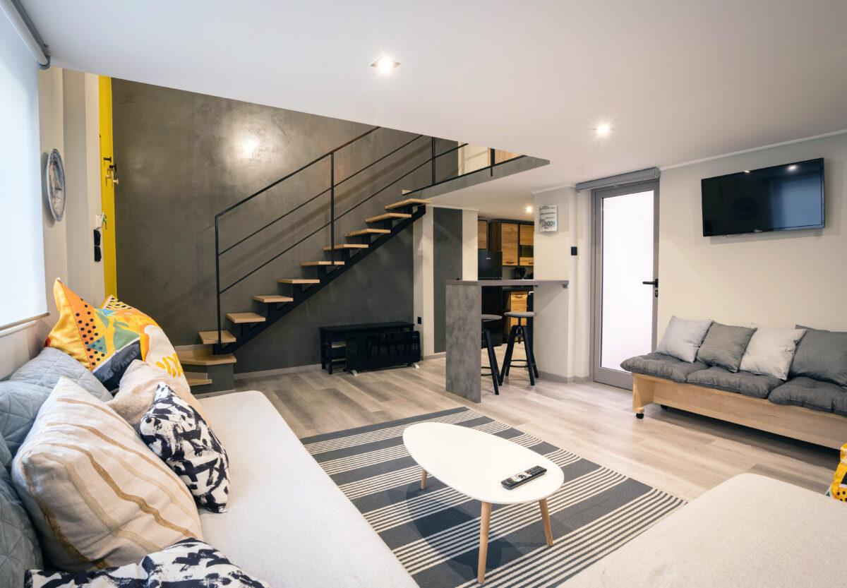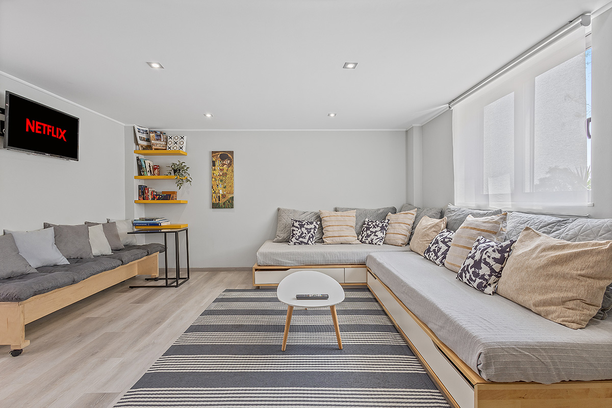 On the ground level, there are two single beds that double as sofas when the space is not occupied by a third or fourth guest. This area also includes a smart TV and a small sitting/bench area.