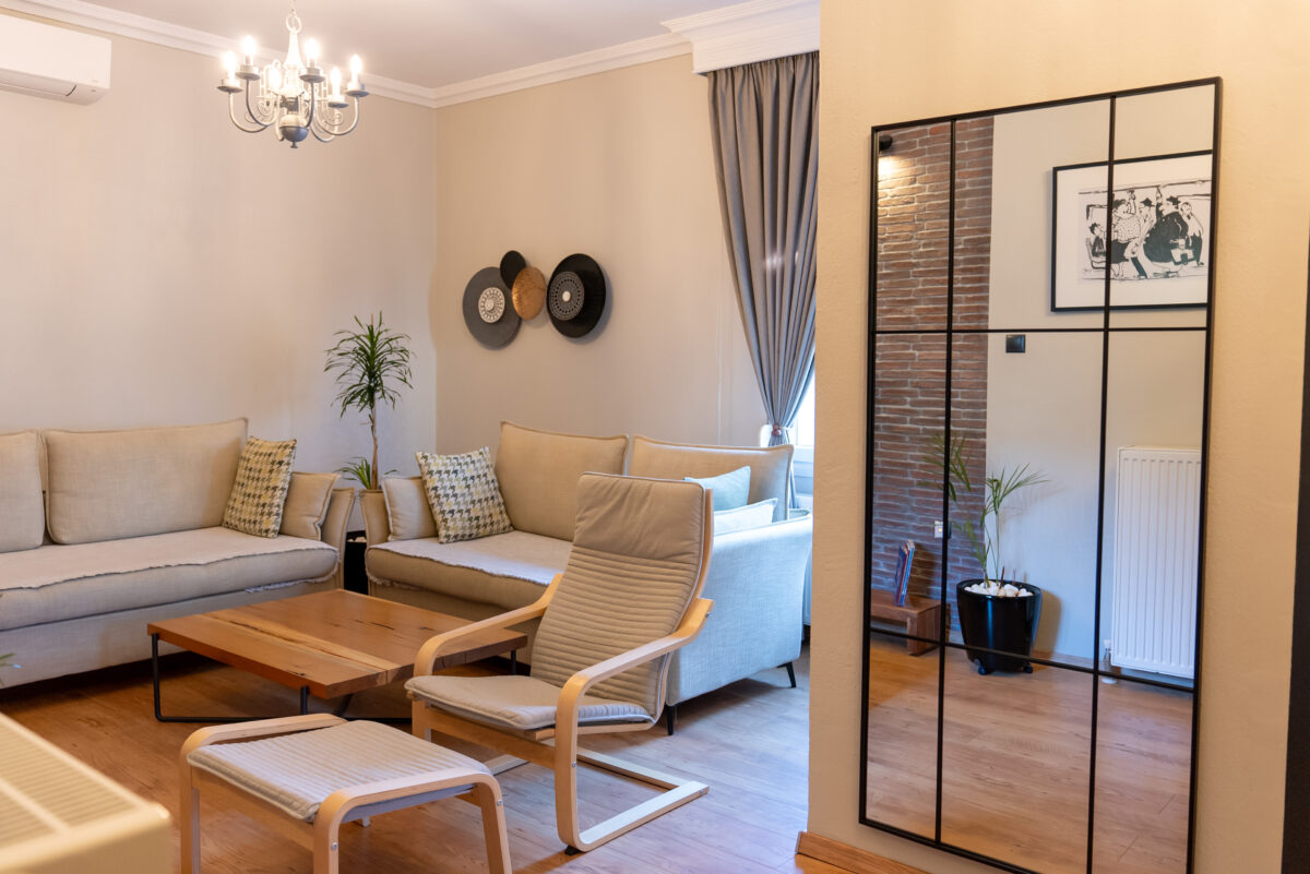 Το διαμέρισμα βρίσκεται στον πρώτο όροφο διόροφης οικοδομής σε ήσυχη γειτονιά ,σε απόσταση 10 λεπτά με τα πόδια από το κέντρο της πόλης της Κομοτηνής και είναι προσφάτως ανακαινισμένο .Στον εσωτερικό του συνδυάζεται αρμονικά η άνεση και η απλοτητα με την κομψότητα.Διακοσμημένο με προσωπικό γούστο αποπνέει ζεστασιά και δημιουργεί ένα κλίμα οικειότητας που θα σας κάνει να αισθανθείτε “στο σπίτι σας”.Το ενα υπνοδωμστιο διαθετει king size κρεβατι και ενα σταθερο βρεφικο κρεβατι ενώ το άλλο υπνοδωμάτι διαθέτει διπλο κρεβάτι, ενώ μπορούν να φιλοξενηθούν και άλλα δύο άτομα στο σαλόνι στους δύο τριθέσιους καναπέδες.Ιδανικό για οικογένειες καθώς διαθέτει πλήρως εξοπλισμένη κουζίνα(μεγάλο ψυγειοκαταψυκτη , φουρνο , φουρνο μικροκυματων ,πλυντηριο πιατων , καφετιερα γαλλικου , μηχανη για espresso , τσαγιερα , τοστιερα , multi ) ,πλυντήριο ,στεγνωτήριο ρουχων και μπορεί να σας διατεθεί δωρεάν κατόπιν συνεννόησης βρεφικό λίκνο ,καρεκλάκι φαγητού,προστατευτικό κάγκελο κρεβατιού και βρεφικό καρότσι. Επίσης το καταλυμα έχει θερμοπροσοψη και η θερμανση ειναι αυτονομη με καλοριφερ πετρελαιου και για τους καλοκαιρινους μηνες υπάρχει ένα 24αρι κλιματιστικο στο σαλόνι και κλιματικοί σε όλα τα υπνοδωματια
