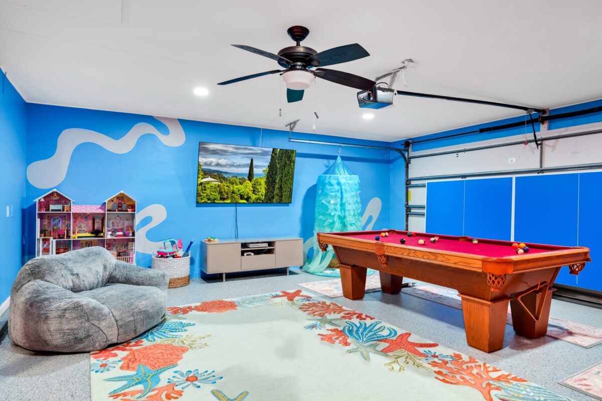 Converted garage game room under A/C with pool table & ping pong
