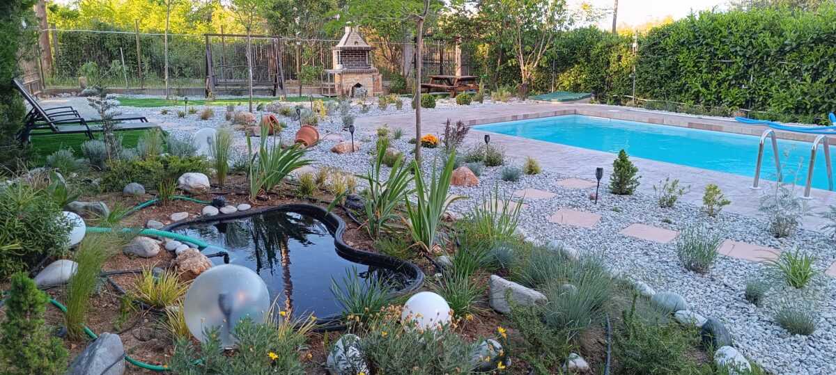 Στον κήπο υπάρχει πισίνα 4*7 μέτρα, με τραπεζαρία και ξαπλώστρες, WC, μεγάλος περιβάλλοντας χώρος με παιδότοπο που περιλαμβάνει , τραμπολίνο, κούνιες,πύργο με τσουλήθρα,μπασκέτα.